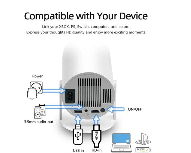 The projector works with smartphones, tablets, laptops, gaming consoles (including PlayStation and Xbox), and streaming sticks like Chromecast or Fire TV.